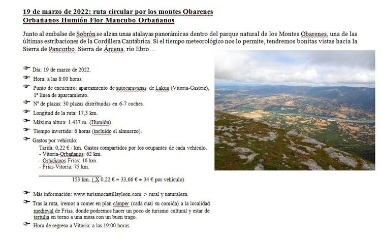 Ruta circular de unas 6 horas de duración (17,3 km.) partiendo del pueblito de Orbañanos. Tras el obligatorio cambio de ropa y calzado, iremos al pueblo medieva.l de Frías, donde comeremos cada cual lo que lleve y aprovecharemos para hacer un poco de turismo. Hora estimada de regreso a Vitoria a las 19:00 horas. Se adjunta foto con toda la información.